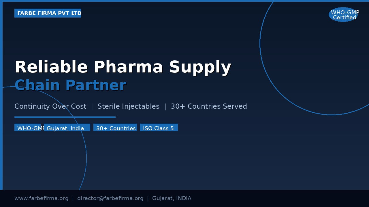 For sterile injectables — where stockouts can mean patient harm and lost institutional contracts — supply reliability is non-negotiable. This article unpacks what genuine supply chain reliability looks like in pharmaceutical manufacturing, the warning signs of a fragile supplier, and how Farbe Firma's operations in Gujarat, India deliver on-time injectable supply across 30+ countries.